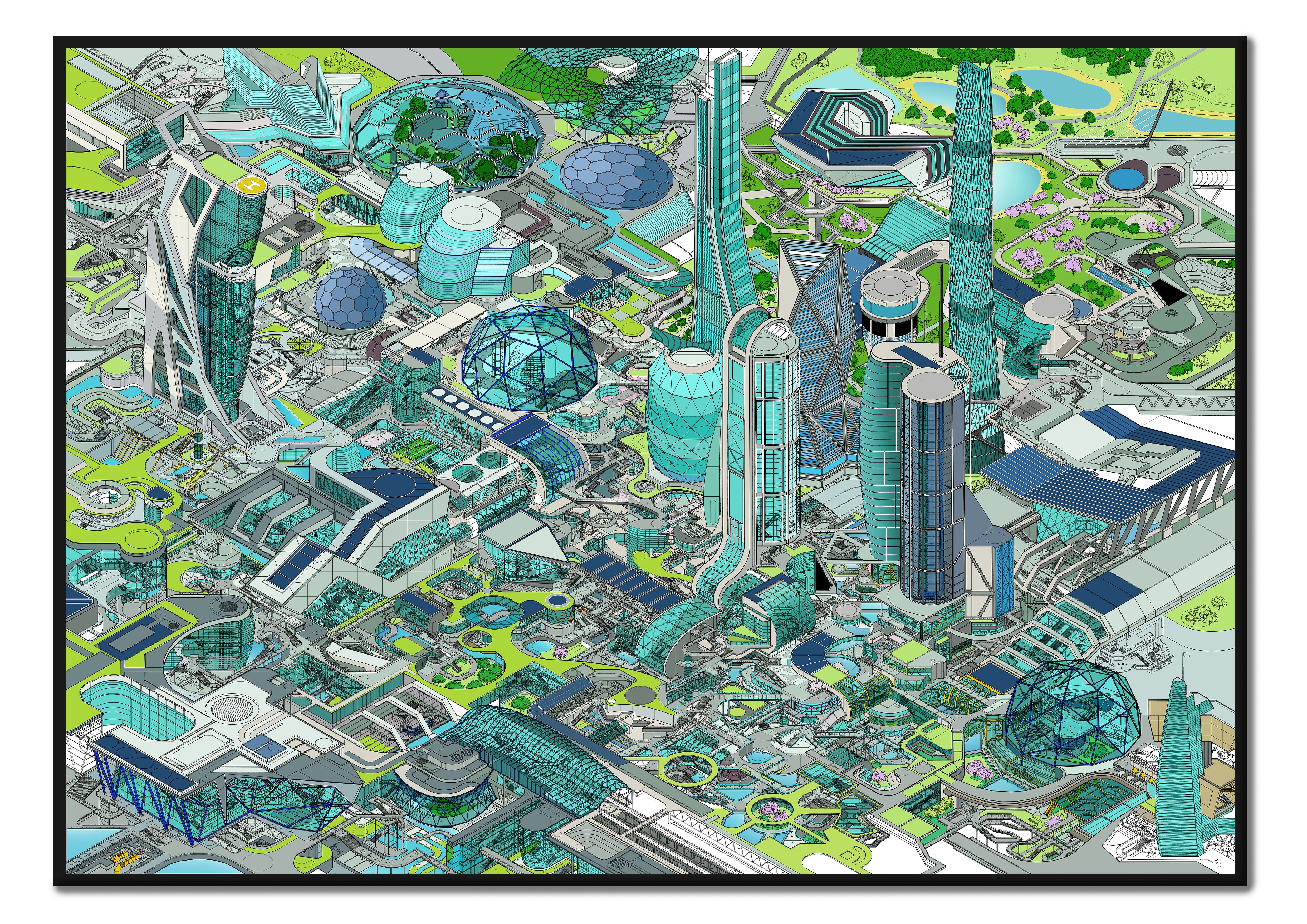 Discover Metropolis Colour, an isometric futuristic cityscape art print by Peter Wheatcroft. This detailed hand-drawn architectural illustration — expertly coloured in Photoshop — captures a visionary garden metropolis of glass towers, urban plazas, and imaginative public spaces.