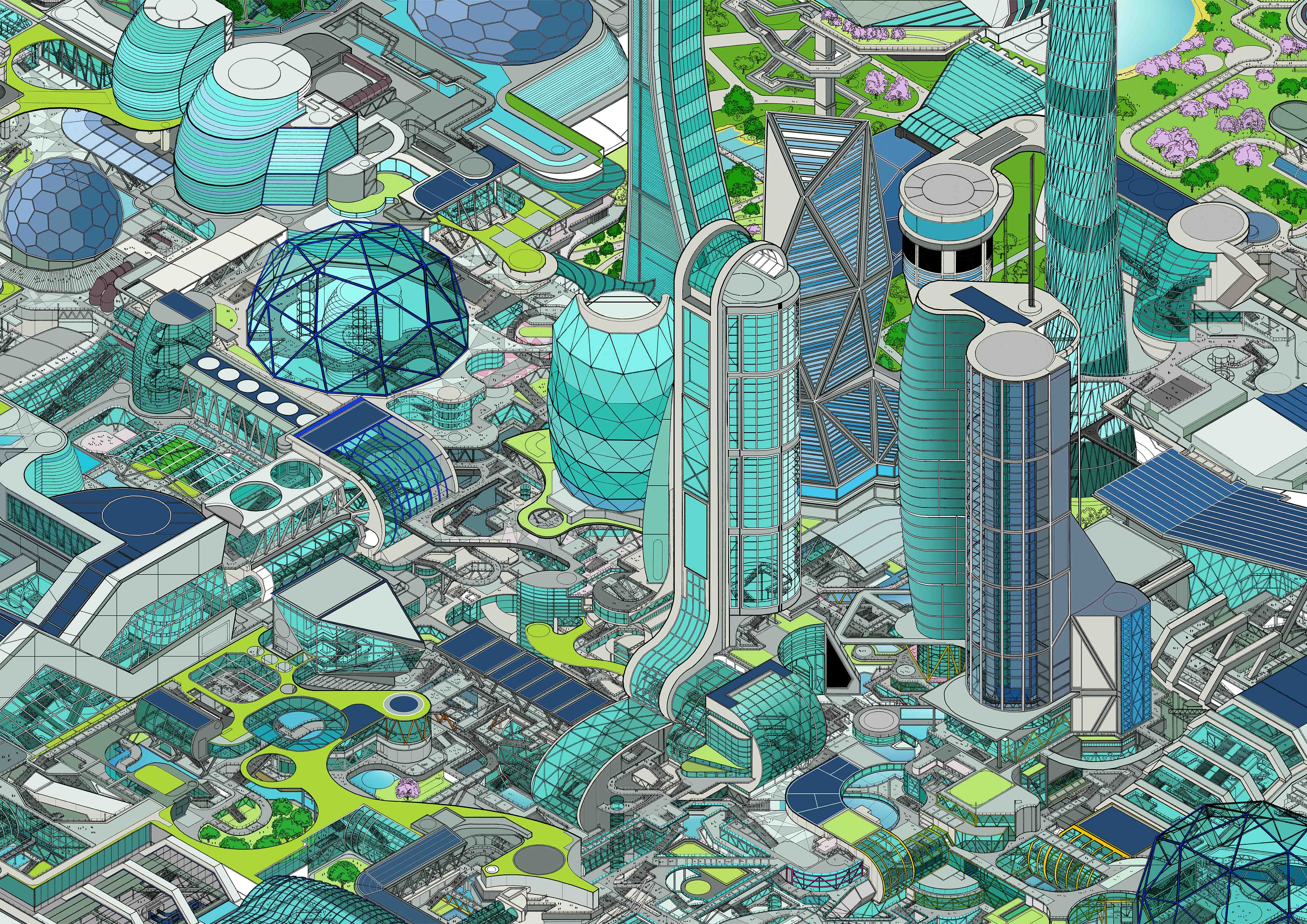 Metropolis Colour – Isometric Futuristic Cityscape Art Print