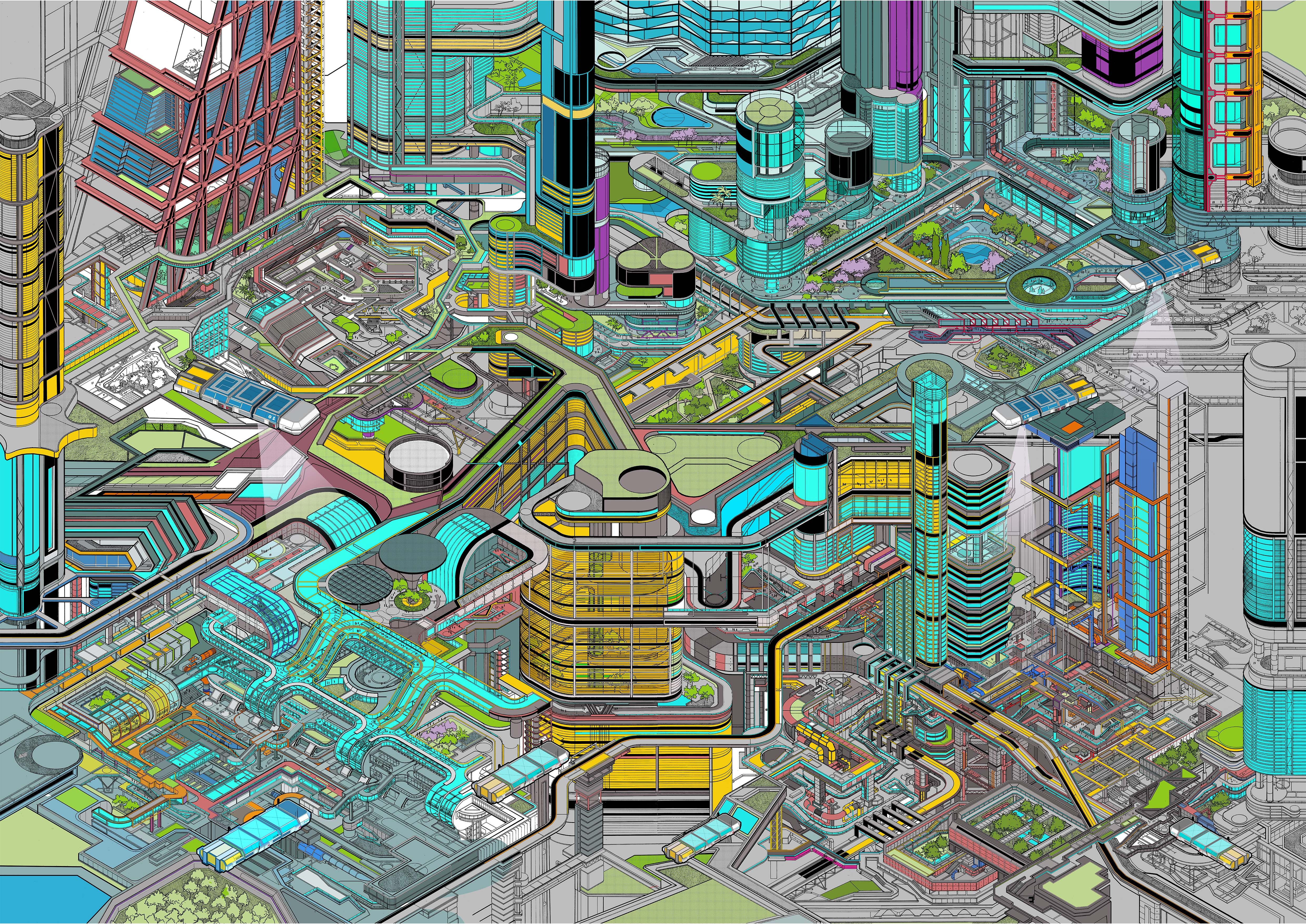 Created with precise hand-drawn line work and digitally coloured in Adobe Photoshop, this artwork blends intricate architectural drafting with a compelling futuristic aesthetic.
